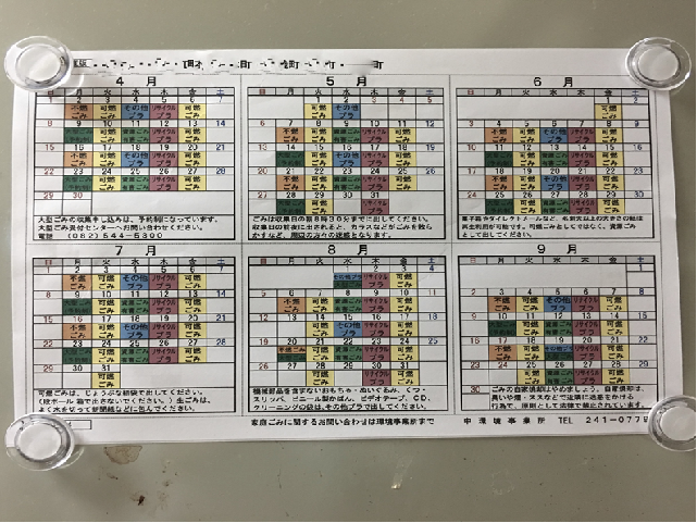 | ゴミ屋敷になった原因の一つにヒアリングで「ゴミを間違えて出して注意され、それから不安で出せなくなりました」とお聞きしていました。 ゴミの出し方で迷い家の外に出せない…まじめな方に多いのが特徴です。 広島市のホームページからお客様のご住所のゴミカレンダーを印刷し、流し台横の冷蔵庫に張りました。 「これで、不安なく出せます」喜んでいただけました。 ごみの袋、分別もセットし、ガムテープや小さいゴミ出し用の袋を持参し出せる仕組みも作りました。 |