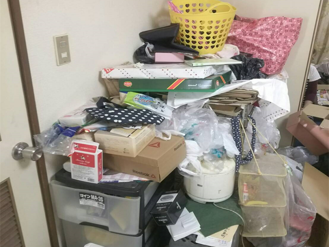 | 奥には出そうと思っていてそのままになっているゴミがあります。 牛乳パックなど最初は分別されていた様子も見えましたが、その上からはどんどん重ねていくだけに。 ここまでになると、もう一人では片付けることができなくなります。 一人では時間がかかりますし、同時に生活をしているので、疲れてしまい、なおさらです。 生活ごみも同時に出るので片付けサービスを上手に利用して、一度にリセットしたほうがいいでしょう。 |